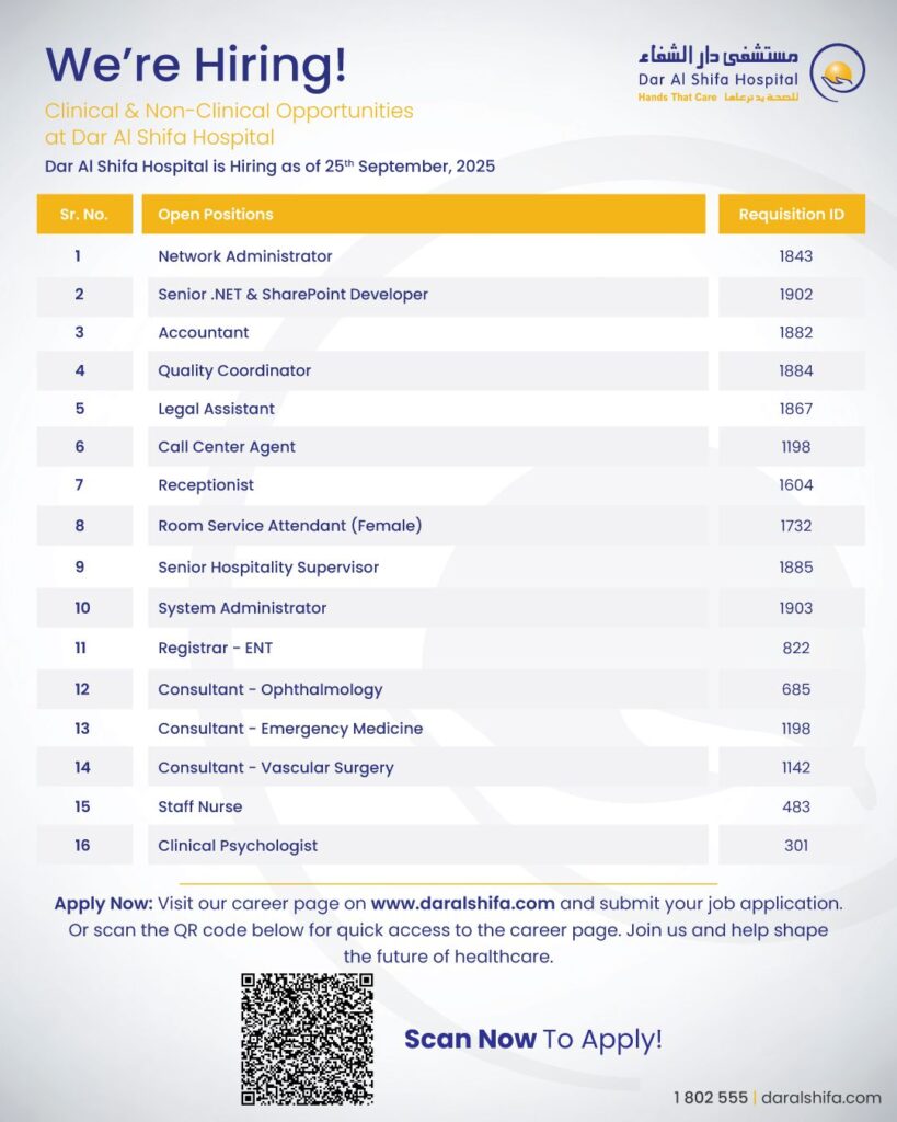 Disclaimer:The information provided in this article about Dar Al Shifa Hospital careers and job vacancies is intended for general informational purposes only. While we strive to ensure the accuracy of the details, all job descriptions, requirements, and application procedures are subject to change by Dar Al Shifa Hospital. Applicants are advised to verify all information and submit applications through the official Dar Al Shifa Hospital careers website. We are not responsible for any errors, omissions, or outcomes related to the application process.