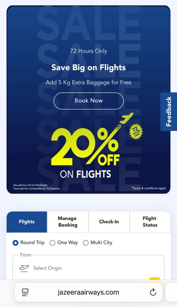 Kuwait – Jazeera Airways has announced a special 72-hour sale, offering passengers a 20% discount on flights to selected destinations across its network. Customers can avail of the offer by using the promo code “J9SALE20” when booking through the Jazeera Airways website, mobile app, or customer service center.